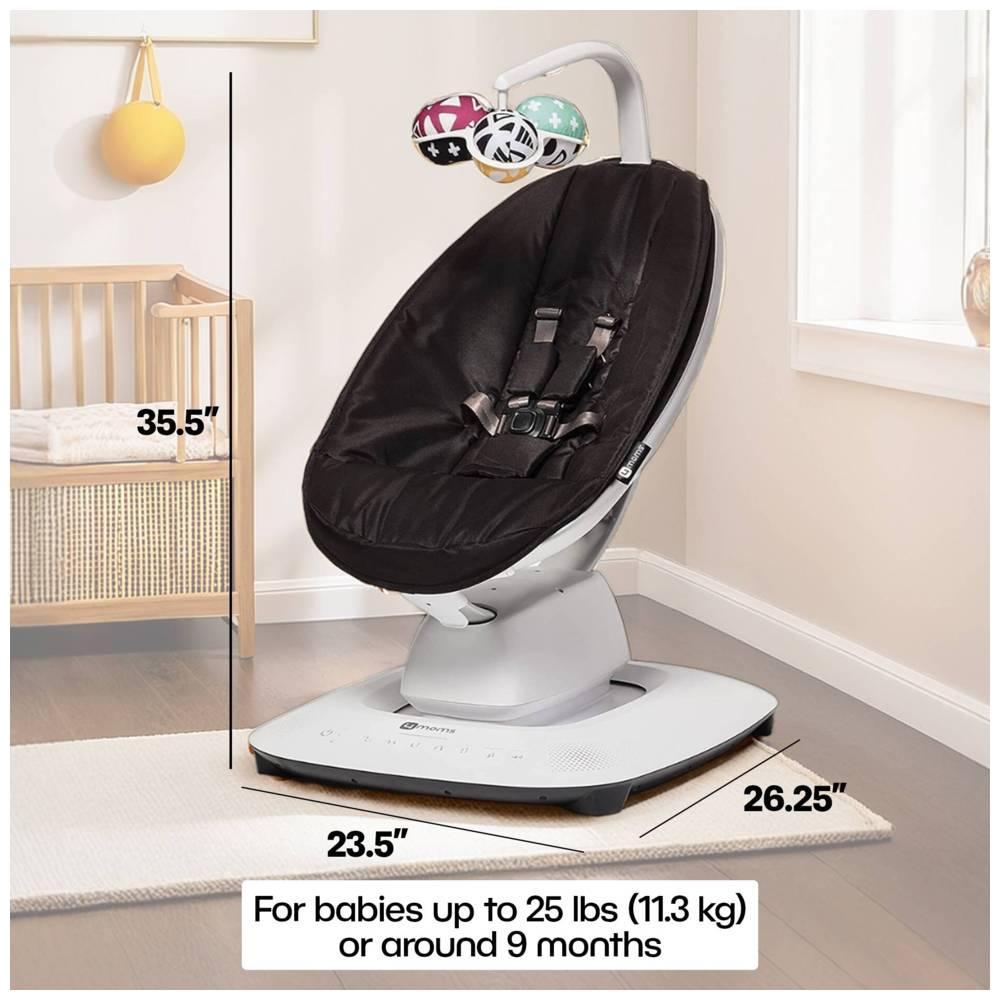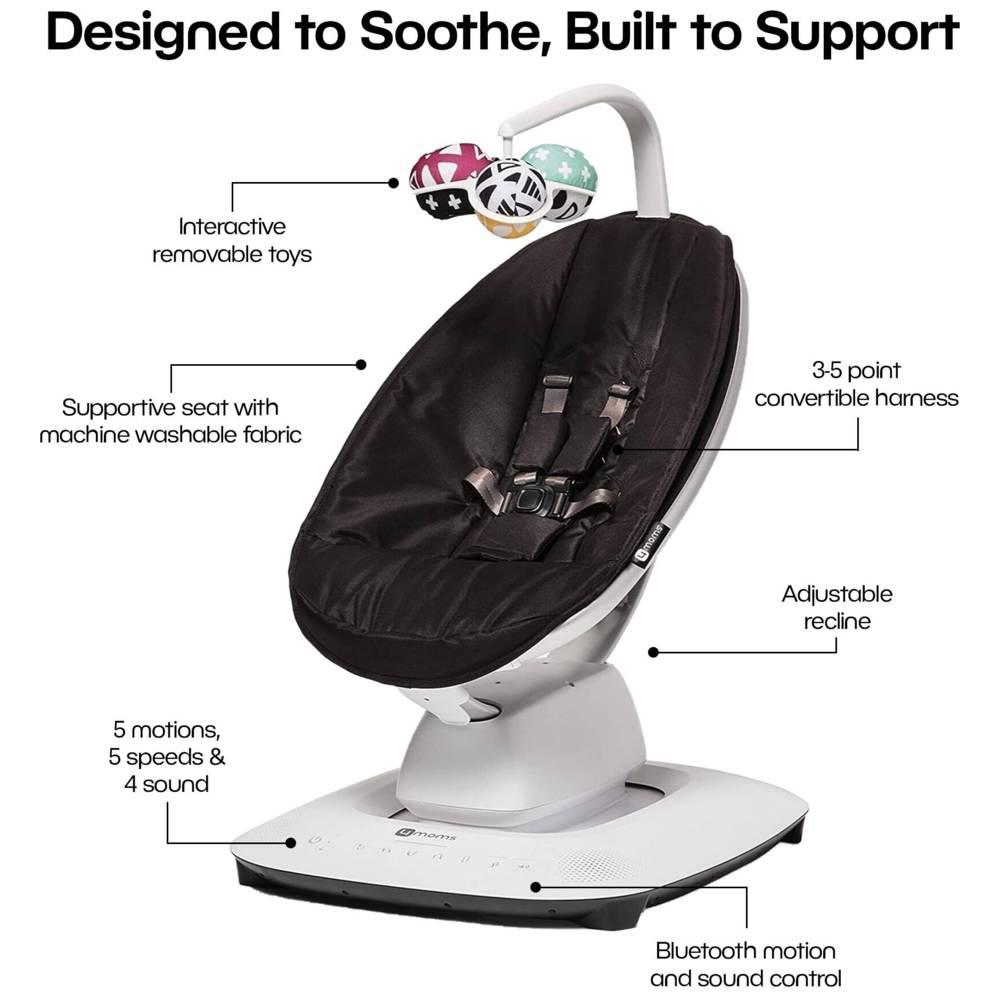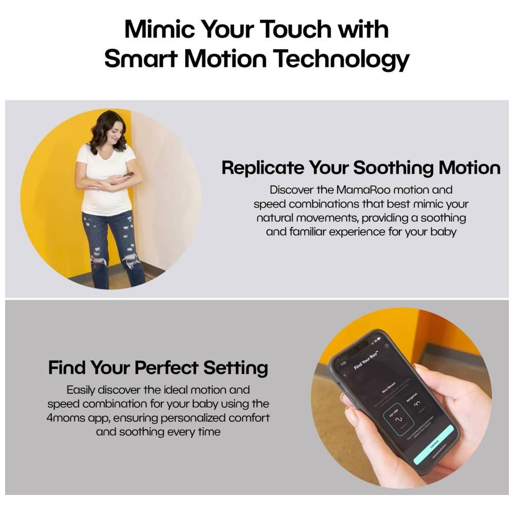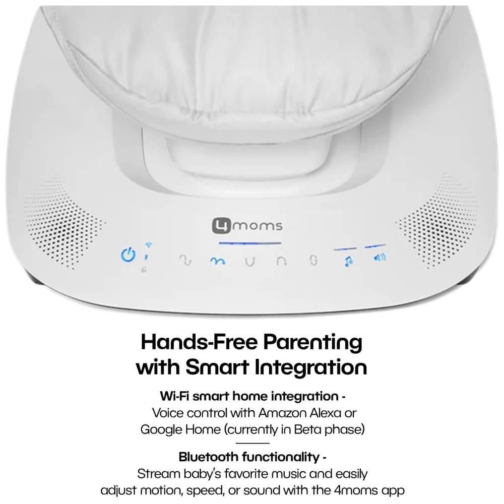 The MamaRoo Multi-Motion Baby Swing is designed to mimic parents' natural rhythms and movements, providing a familiar and secure space to place the baby when they can't be held. With 5 parent-inspired motions, 5 speeds, and 4 built-in sounds, parents can customize the experience to keep their baby entertained. The new Find Your Roo feature in the 4moms app helps identify the best motion and speed combination for a seamless transition from arms to swing. Smart-home integration includes Bluetooth functionality for streaming music and adjusting settings through the 4moms app, as well as Wi-Fi compatibility for voice control with Amazon Alexa and Google Home (currently in Beta phase). The swing features an adjustable recline, a toy mobile with interactive, reversible toy balls, and a convertible harness that switches between a 5-point and 3-point setup as needed. It operates with an AC adapter, eliminating the need for batteries, and it assembles easily without tools. While the MamaRoo provides a hands-free moment for parents, this product is for supervised use while awake. If your baby falls asleep, move them to a flat, safe sleep surface for their comfort and well-being.