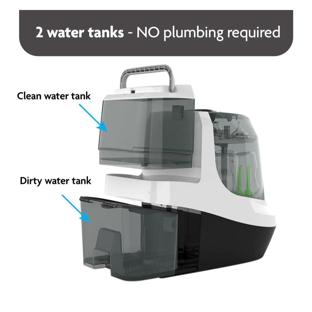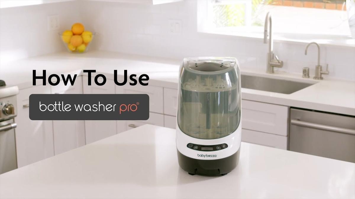 Say goodbye to your bottle brush and drying rack and say hello to the first appliance that automatically washes, sterilizes and dries bottles and accessories at the push of a button! The Bottle Washer Pro powerfully cleans off milk residue with 20 high pressure spray jets that thoroughly wash and rinse bottles, pump parts, sippy cups and accessories inside and out. It goes through 3 rinse cycles to ensure all soap residue is removed, unlike other washers that only rinse twice. The machine also uses natural steam to kill 99.9% of germs, then dries completely with germ-free, HEPA-filtered hot air. The Bottle Washer Pro holds up to 4 bottles, pump parts, sippy cups and accessories from virtually all brands, including plastic, silicone and glass bottles. It offers 6 functions and is clinically proven to clean significantly more effectively than bottle brushes. It has removable clean and dirty water tanks instead of a messy drain hose, so it doesn't require a sink hook up, and can be used anywhere in your kitchen or around the house - even in the nursery or bedroom! This all-in-one cleaning machine is eco-friendly and uses 85% less water than handwashing. Use with the Baby Brezza Breast Pump Rack (sold separately) to powerfully and precisely wash ALL breast pump parts, including wearable pumps, flanges, shields, collection cups, valves/membranes and storage bottles. Requires use of Baby Brezza Detergent Tablets (60 FREE tablets included inside). 1 year limited warranty
