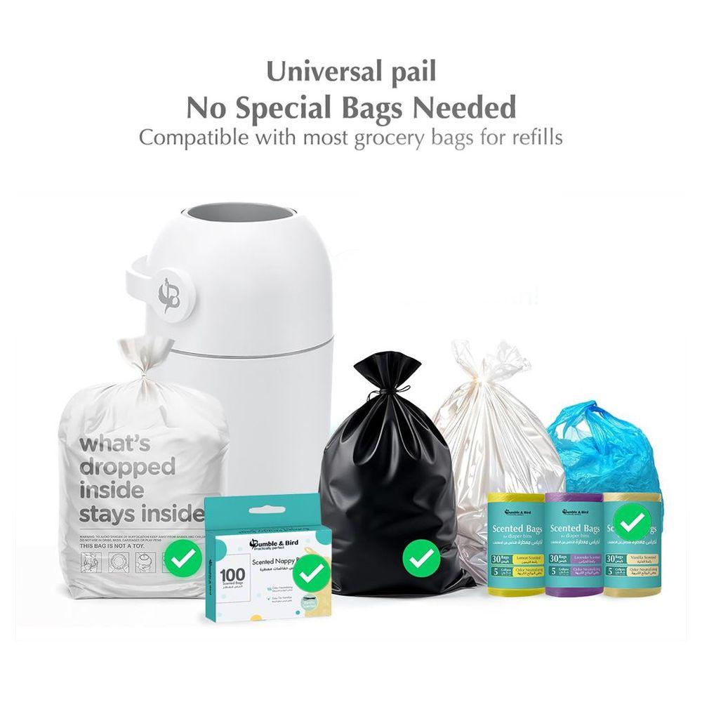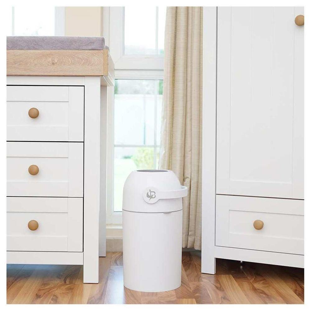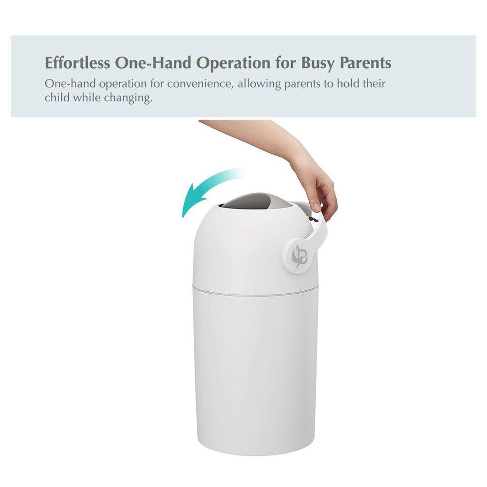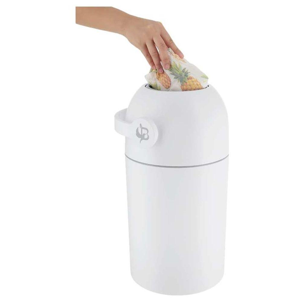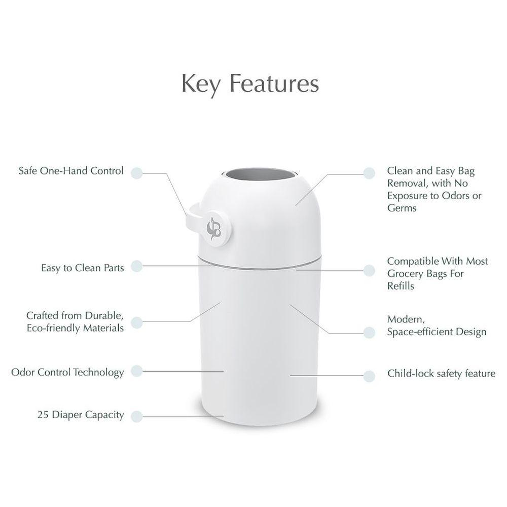 Say goodbye to expensive refills! This practical and stylish diaper pail works with any standard plastic bag, saving you money while offering convenience. Its ergonomic design in classic white seamlessly complements any nursery décor. Embrace the ultimate freshness and effortless style with Bumble & Bird.