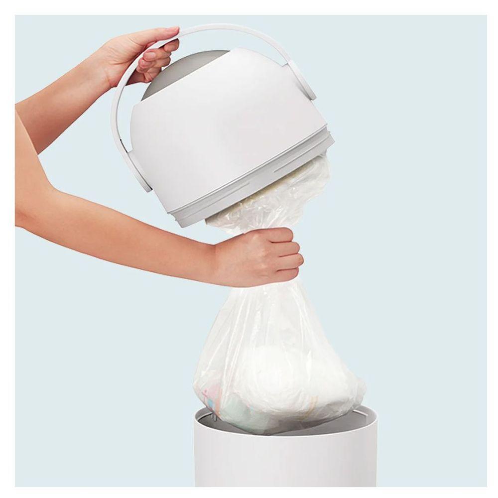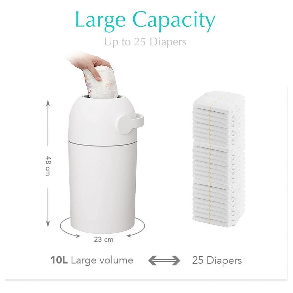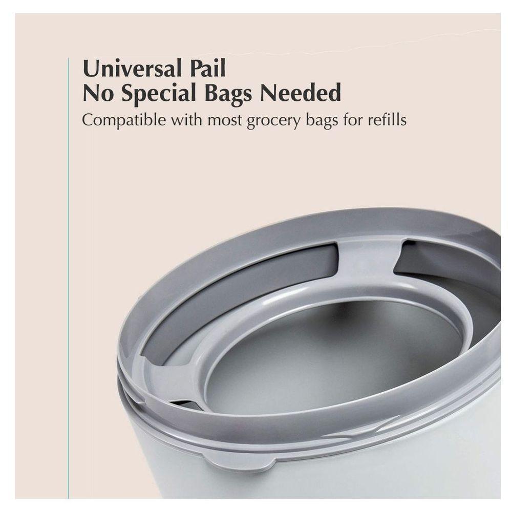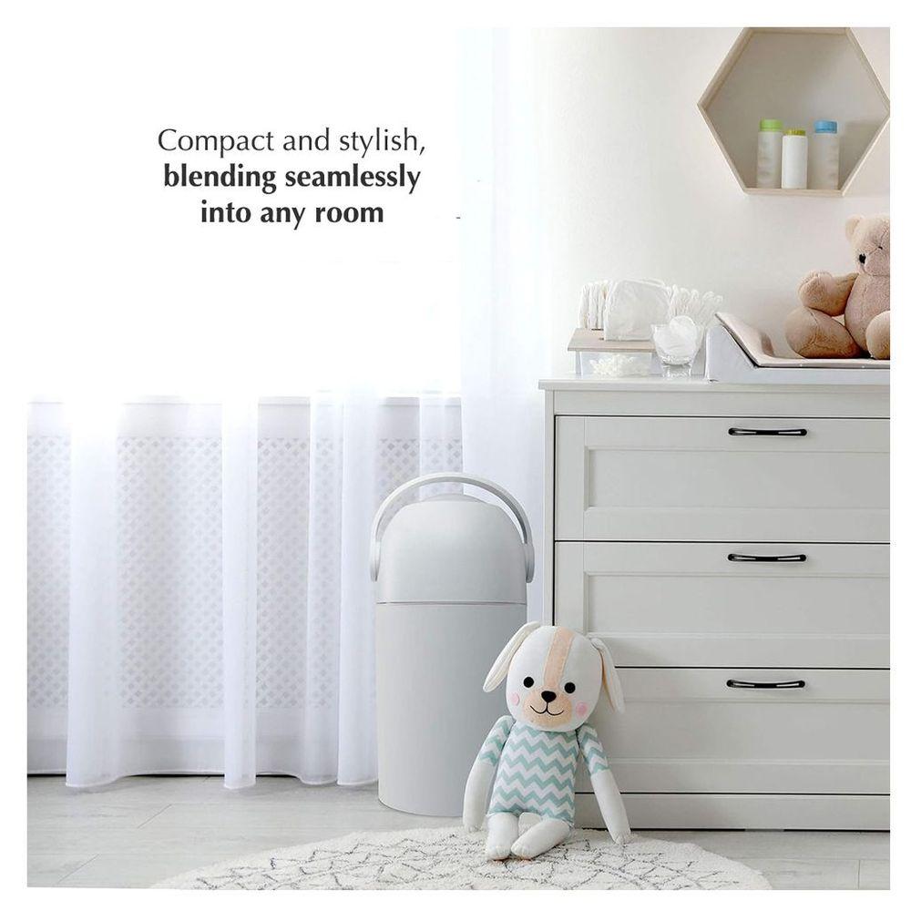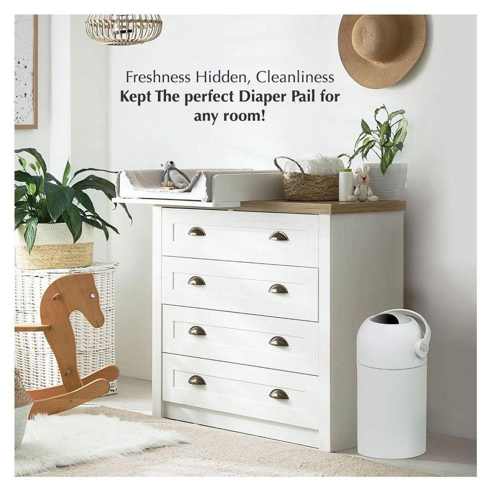 Say goodbye to expensive refills! This practical and stylish diaper pail works with any standard plastic bag, saving you money while offering convenience. Its ergonomic design in classic white seamlessly complements any nursery décor. Embrace the ultimate freshness and effortless style with Bumble & Bird.