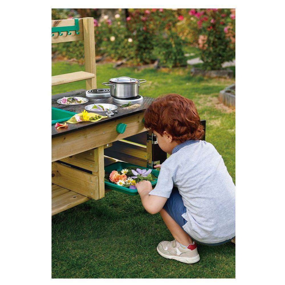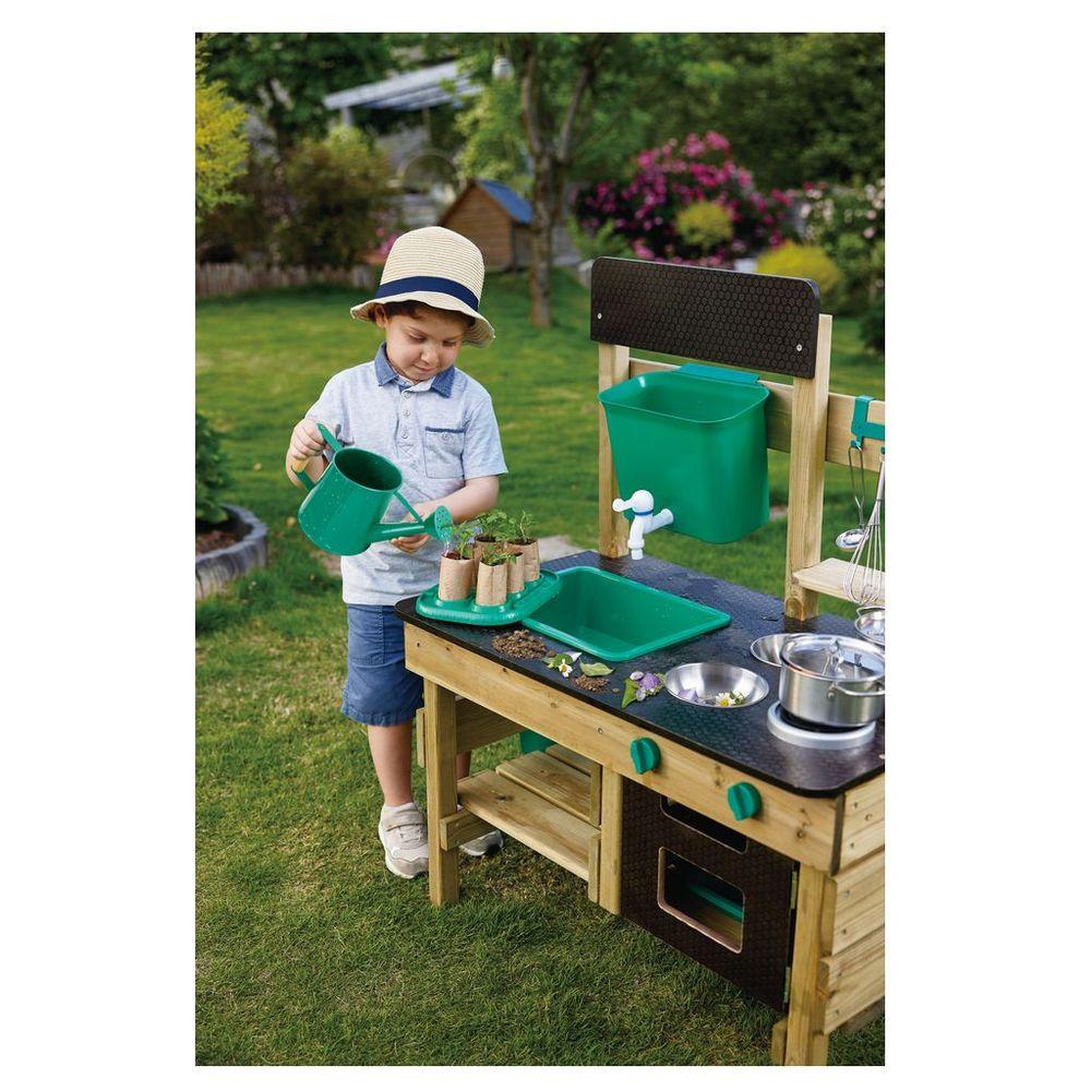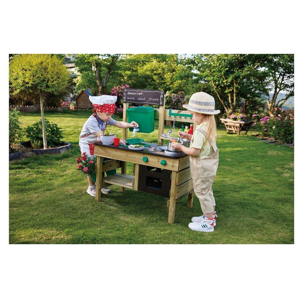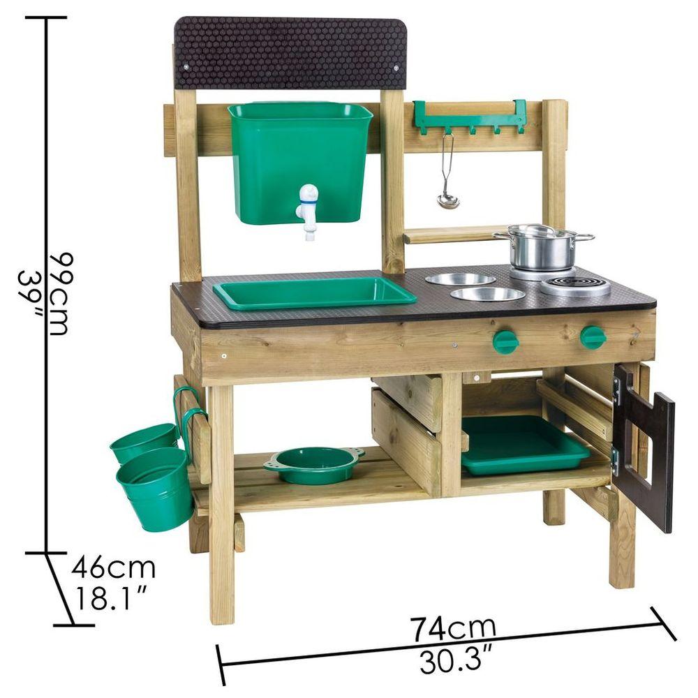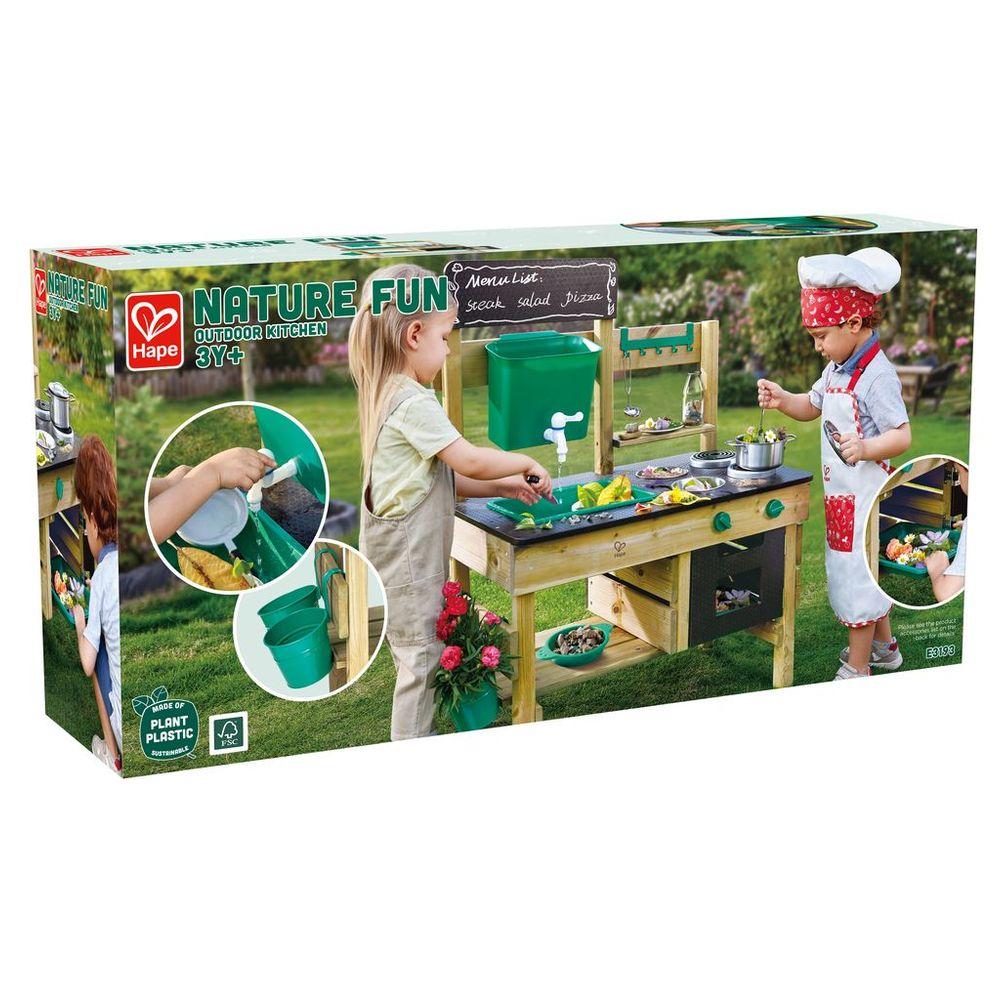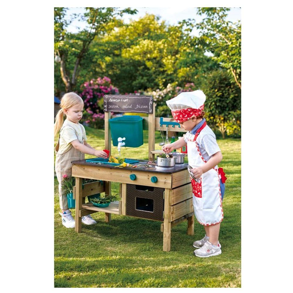 Spark your child's imagination with the Hape Outdoor Kitchen Playset, a delightful wooden mud kitchen designed for endless messy, imaginative fun! This weather-resistant play kitchen features a water tank, working sink, faucet, and an array of accessories including a pot, ladle, bowls, sieve, and flowerpots, plus a blackboard for creative roleplay. Your little chef can whip up mud pies or rock stew, fostering exploration, fine motor skills, and vital pretend play.