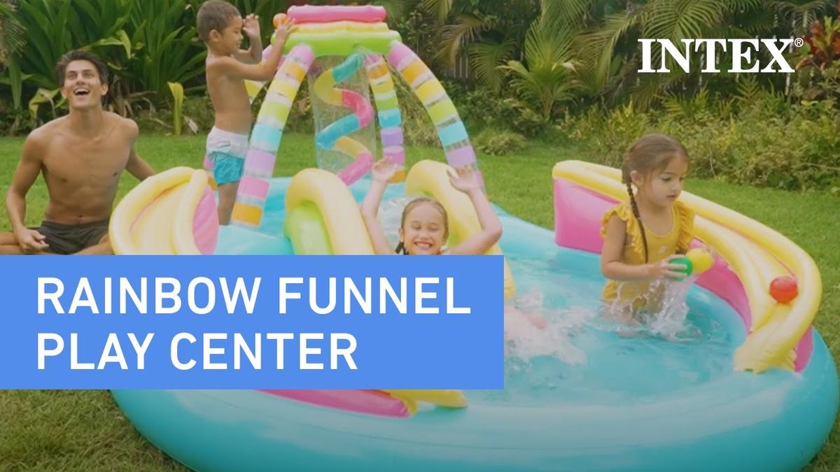 The Intex Rainbow Funnel Water Play Center is an inflatable adventure zone built for sunny fun. With a vibrant rainbow design, this set features a dual-pool layout connected by a built-in waterslide with separate air valve and a max weight capacity of 81 kg. An overhead sprinkler activates via garden hose for a continuous water spray, keeping kids cool while they play. Colorful plastic balls add to the interactive features, encouraging active movement and coordination. Crafted from durable PVC material, it’s a must-have for backyard play.