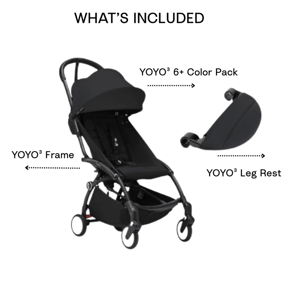 A: This set includes the YOYO stroller (frame and 6+ color pack) and the YOYO leg rest.