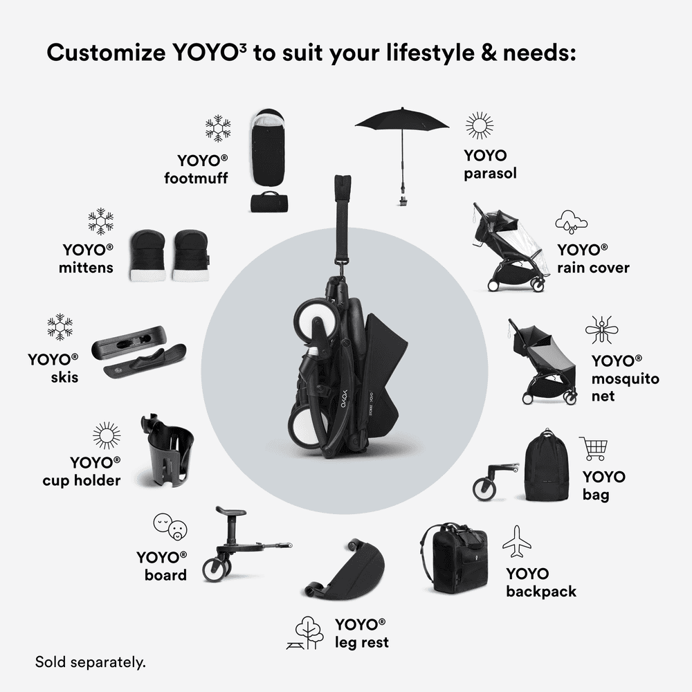 Meet your new best friend for family adventures: the innovative YOYO® stroller bundle! This ultra-light travel essential is suitable from 6 months and is the perfect "grab-and-go" solution for busy parents navigating city streets, public transport, or air travel, thanks to its compact fold (cabin baggage dimensions*). Weighing only 6.59kg (15.53lbs), it’s easy to carry over your shoulder. The bundle includes the YOYO® stroller (frame and color pack) and the YOYO® leg rest for extra support. Key features include an aluminum black frame, a 5-point harness, and a multi-position reclining backrest with redesigned seat pad and new pillow.